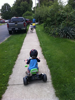 With the beautiful summer weather, the boys have started up a new hobby. A few years back some friends of ours gave us a remote control snow mobile that they weren't using any more. It has become one of their favorite activities with dad, hanging out on the tailgate of his truck and watching the "bicycle" zoom around the yard.